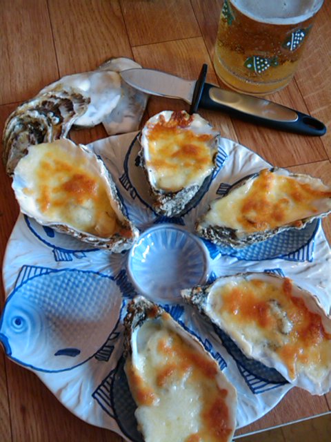 夏が来る前に生牡蠣を6つ、5ポンドで買って、クリームとチーズを乗せ、オーブンで焼きました!