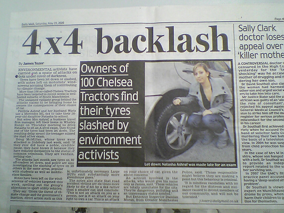 Chelsea Tractorとの異名を持つ、大型4x4の100台超が、マンチェスター南部でタイヤを切られるという事件がありました。