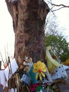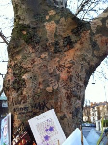 自宅前の木にはメッセージがぎっしり。どれだけファンに愛されていたのかがわかります。
