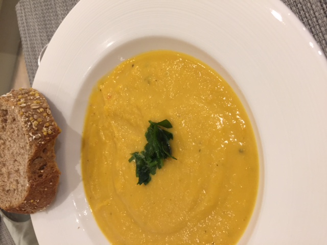 バターナッツかぼちゃをロースト(1時間15分)して、玉ねぎとニンジン、ミルク、ベジストックを