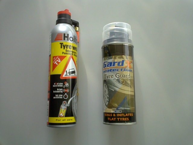 パンクした時に持っていると便利なのが、缶入りの瞬間パンク修理剤です。(写真は左からホルツ社、ガードX社の商品)パンクしたその場でリペアすることができ、ジャッキで車を持ち上げる必要もありません。空気も同時に注入されるので、女の人でもその場で修理ができるすぐれものです。